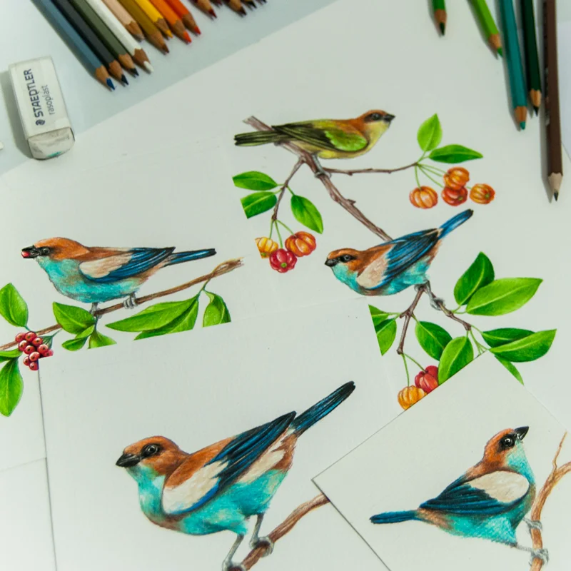 English: "Saíra-preciosa", is the bird chosen as inspiration when idealizing the friendly mascot Sassá, which I created in 2015 for Hotel Torres da Cachoeira. The challenge in this case of character design was to create a friendly interlocutor able to dialogue with the users. The little bird represents the coastal region in Santa Catarina where the hotel is located, and it has similar colors to the brand.
