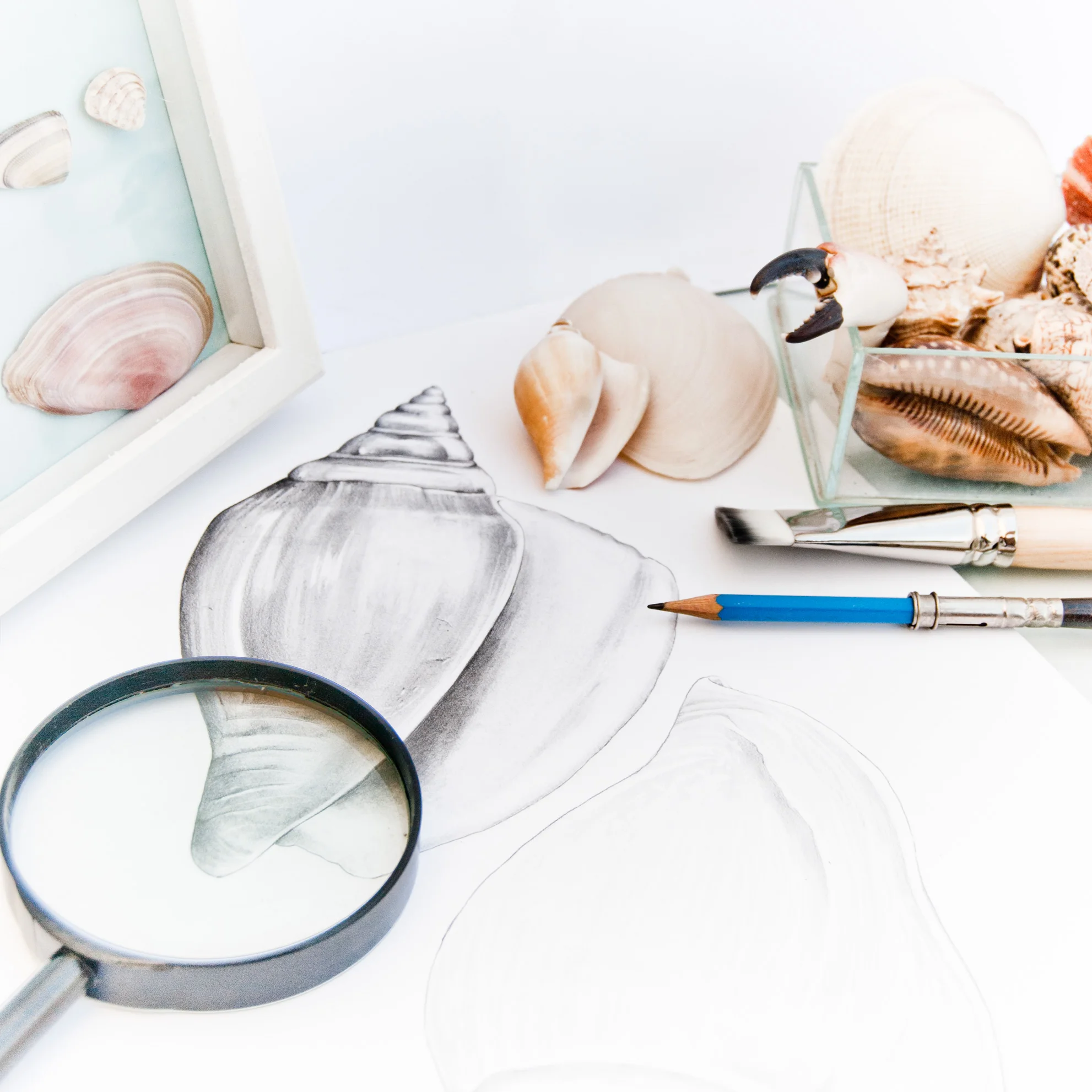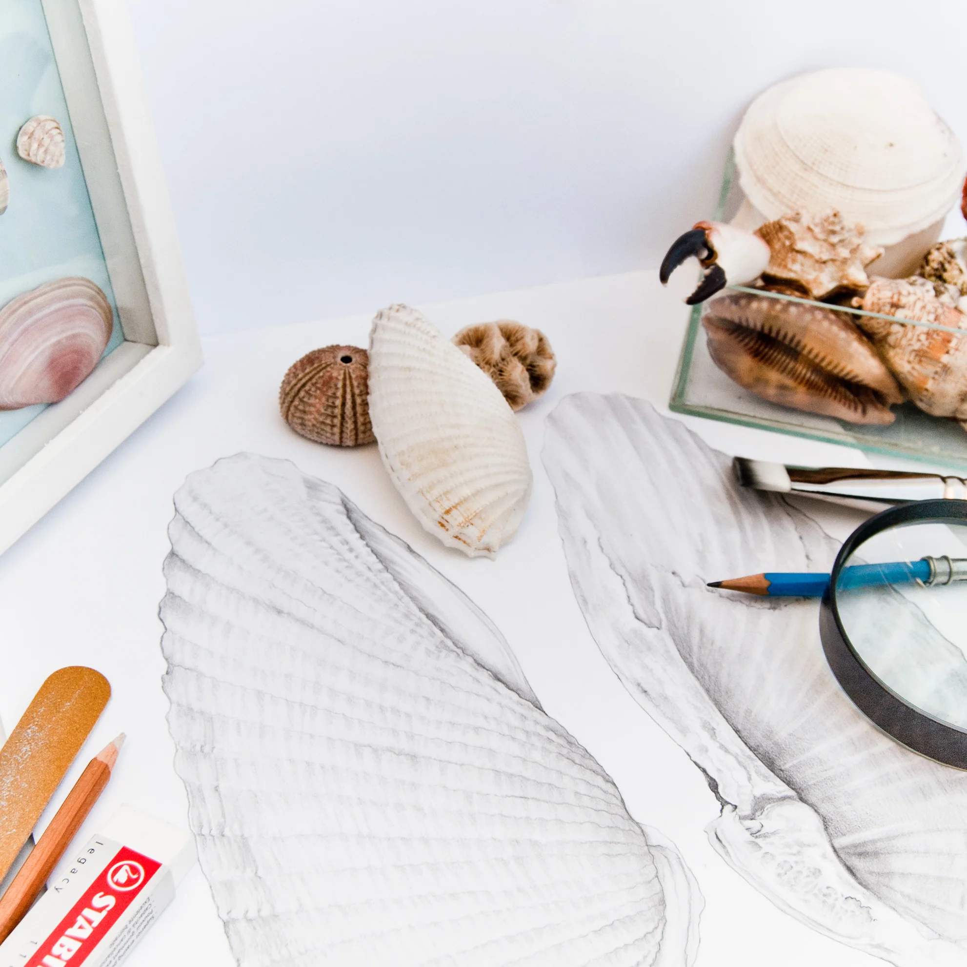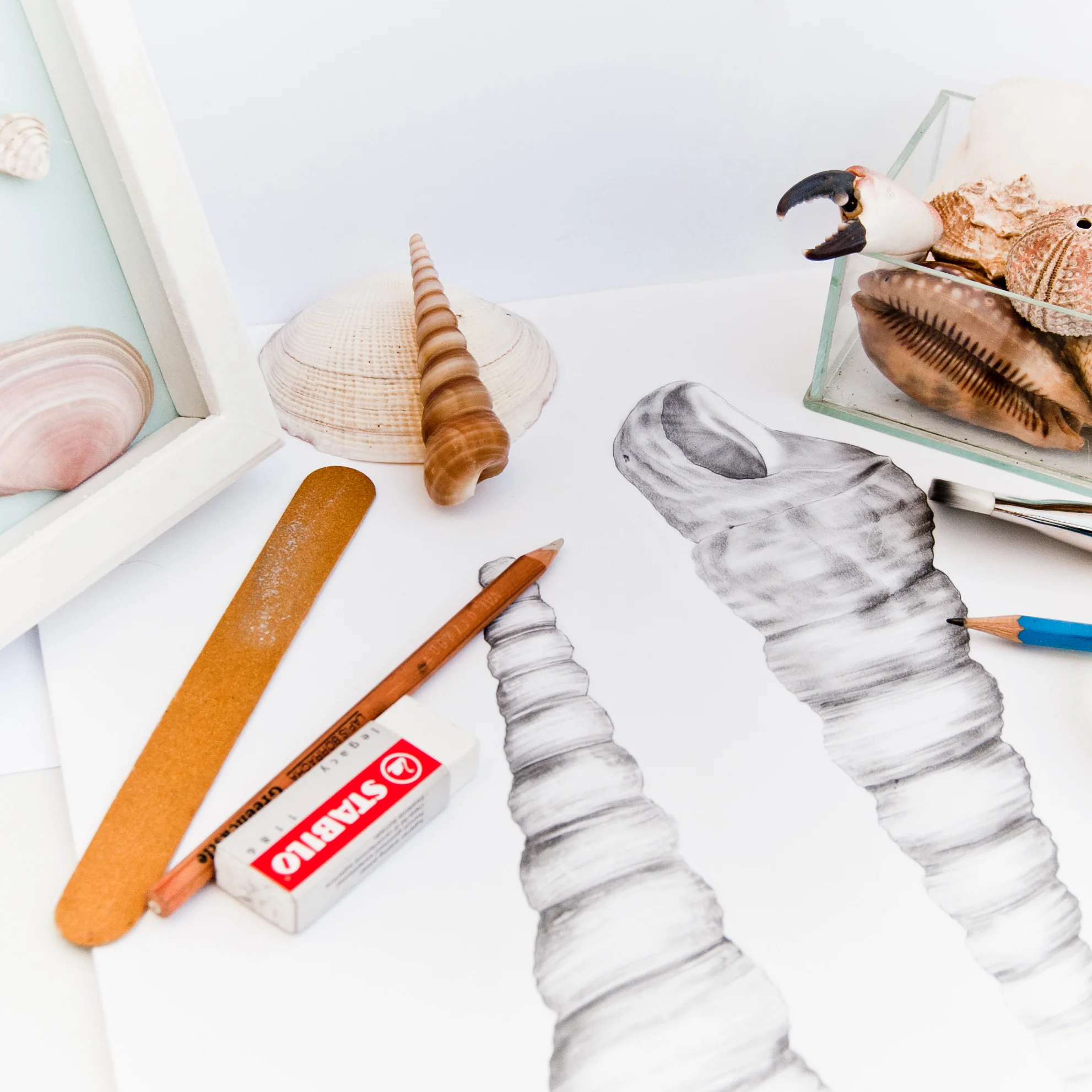 Nessa série espontânea reproduzi 4 conchas de espécimes da minha coleção particular. O intuito dessa série foi explorar a fusão de técnicas físicas e digitais em desenhos científicos. Na ocasião utilizei instrumentos de observação, iluminação estática e grafite sobre papel para criar 2 faces de cada concha, nas quais posteriormente finalizei com colorização digital.