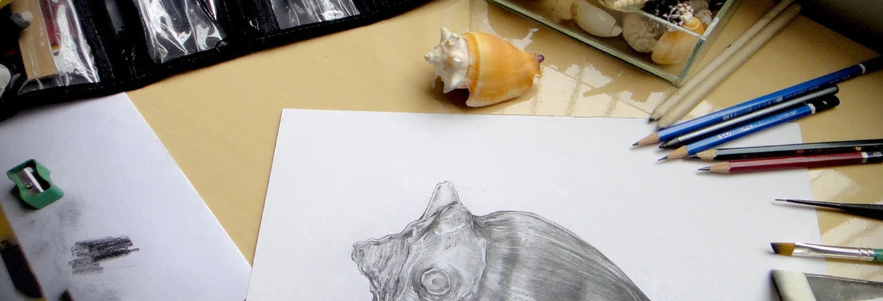 English: In this series of drawings I reproduced four shells from my private collection. The purpose was to explore the fusion of physical and digital techniques in scientific illustrations. I used observation instruments, static lighting and graphite on paper to create the illos that I finished with digital colorization. Strombus pugilis, Mathilda scitula, Laevistrombus canarium, Petricolaria sp.